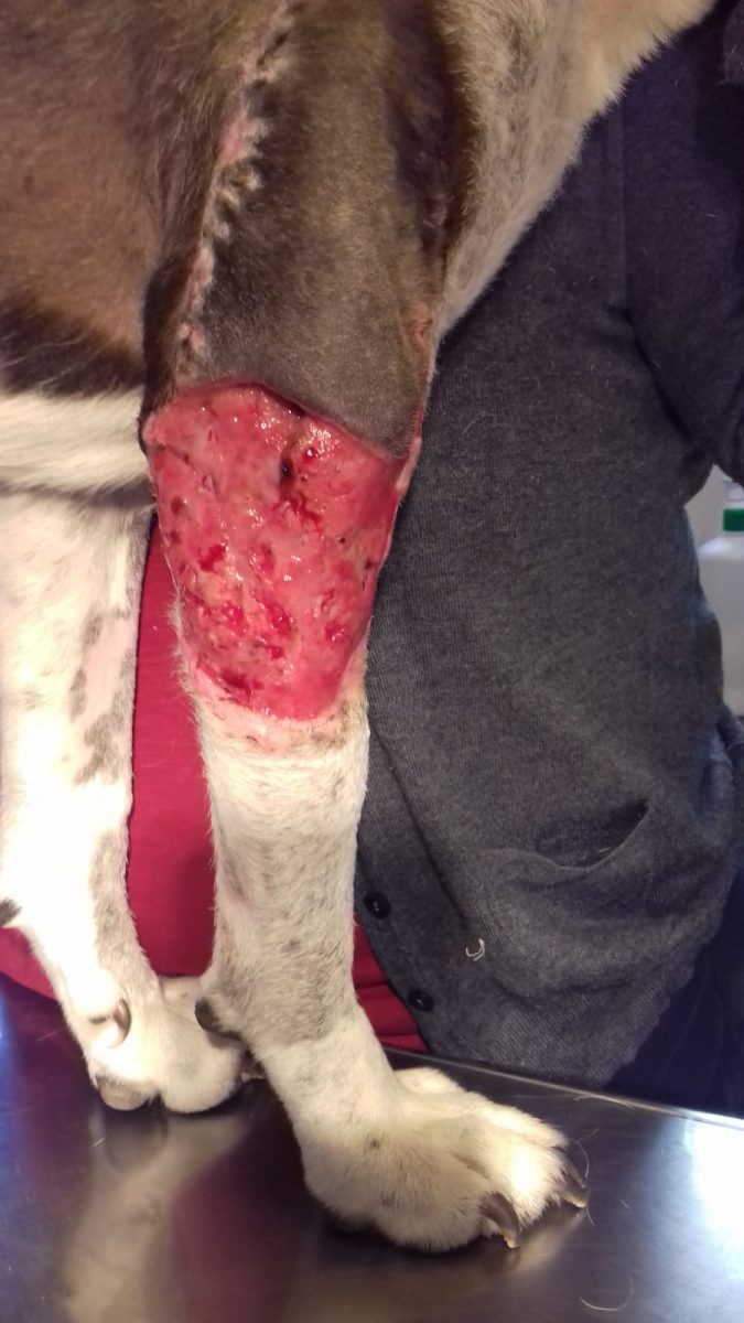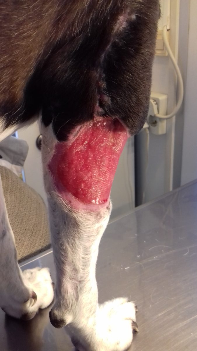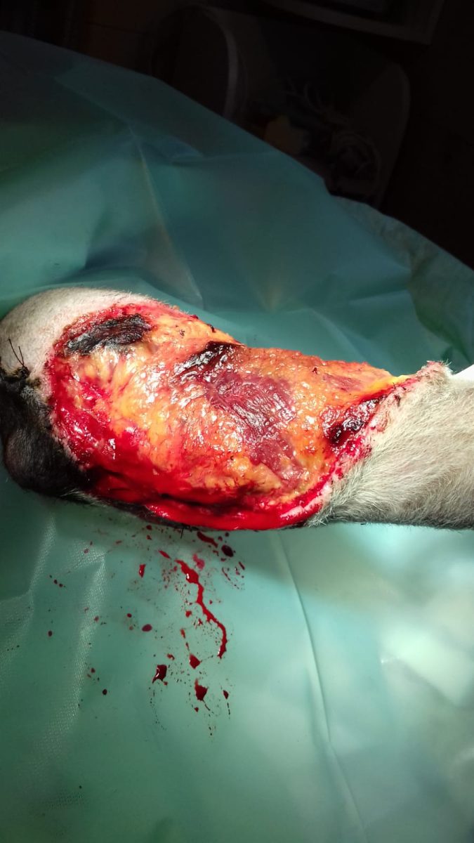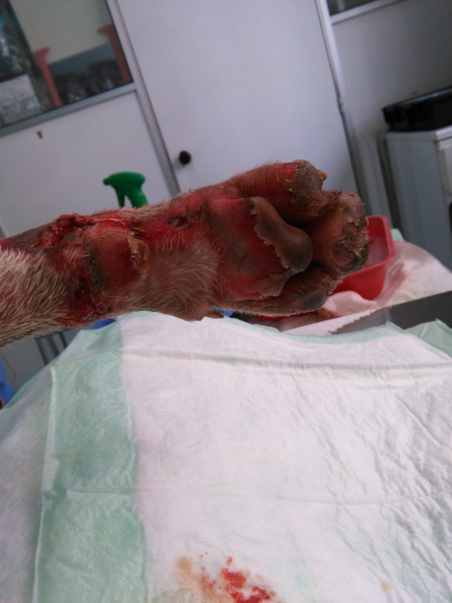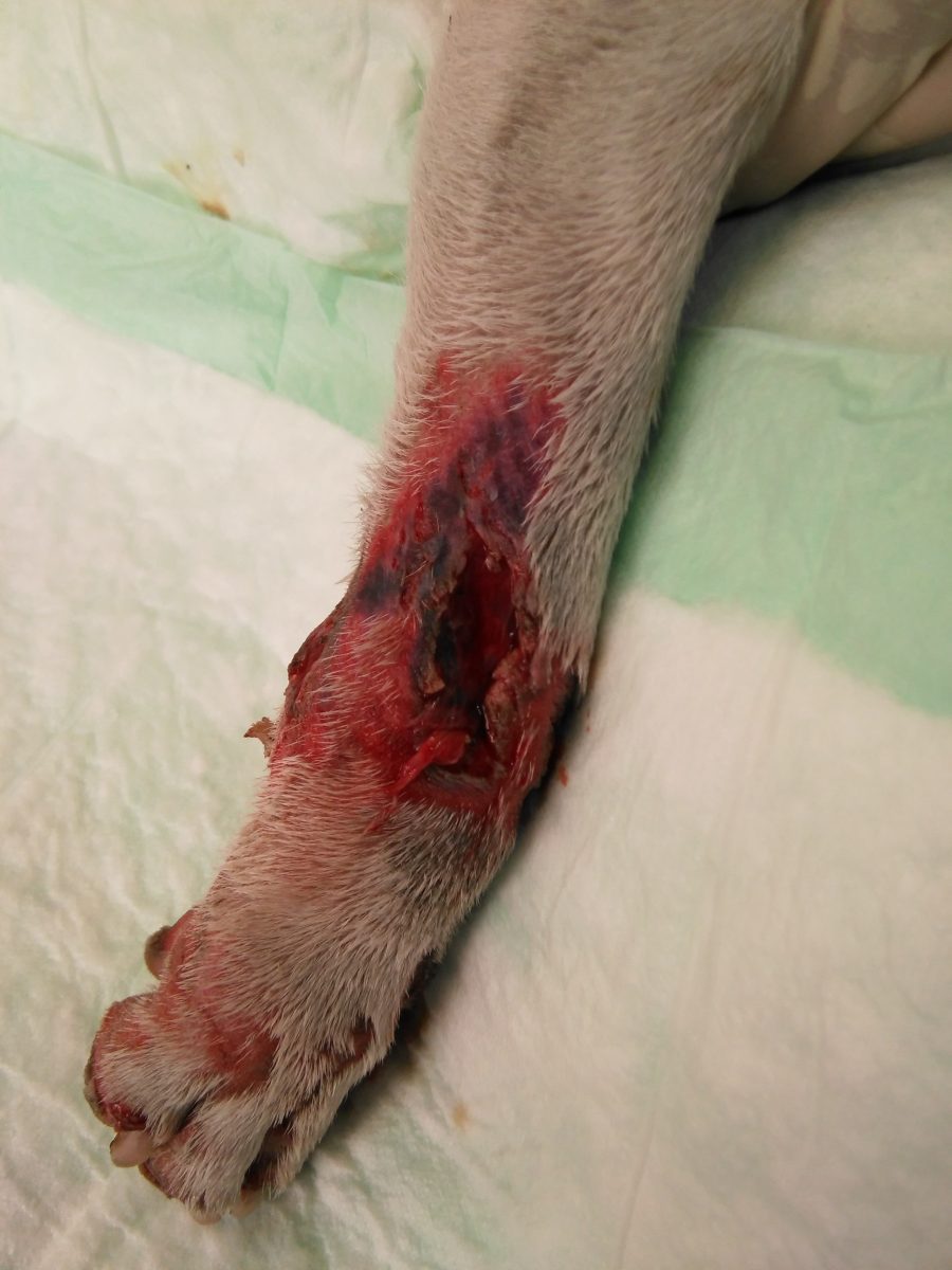 Perro atropellado con lesiones graves en mano con pérdida de tejidos. Tratamiento exclusivo con Ozono.