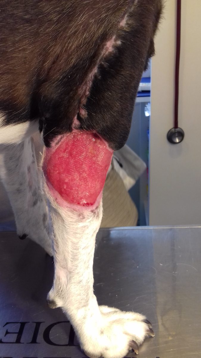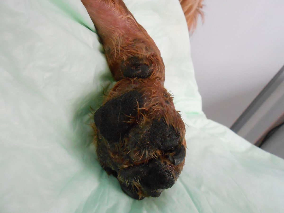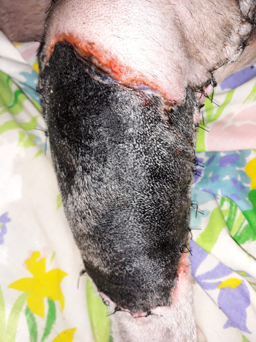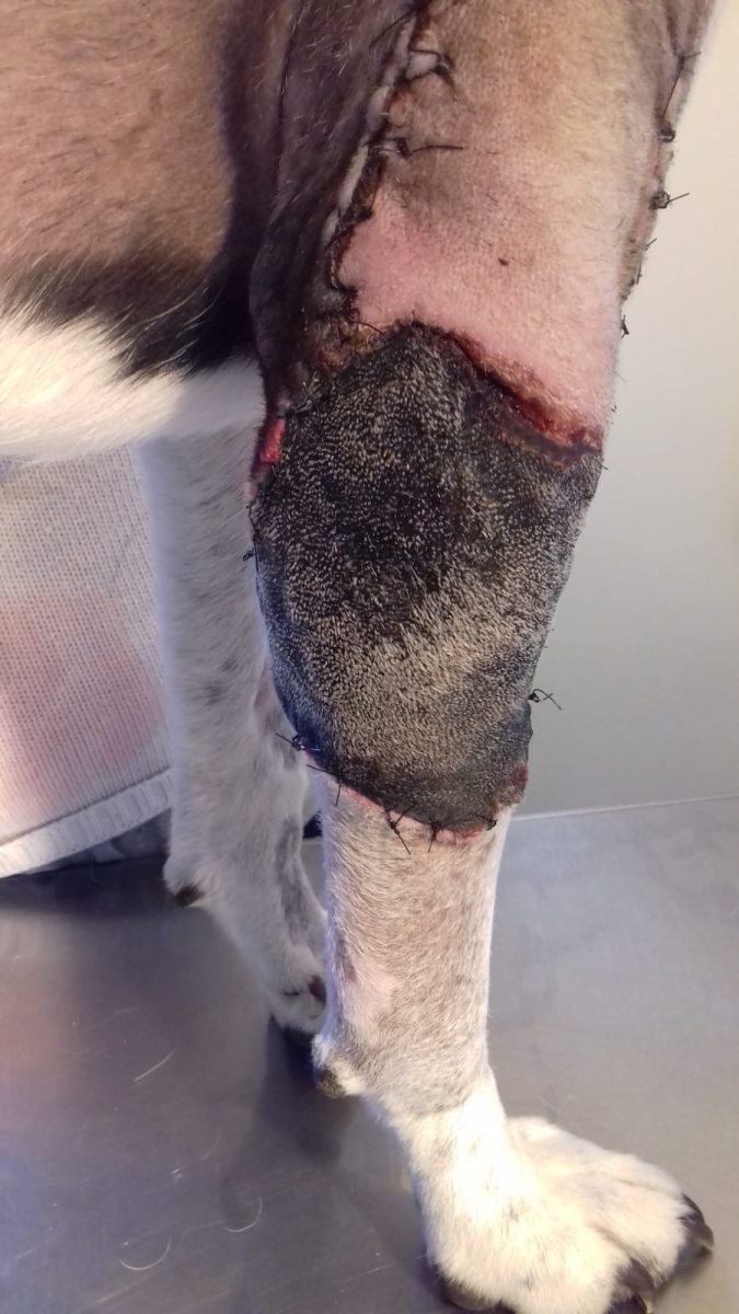 Perro atropellado con lesiones graves en mano con pérdida de tejidos. Tratamiento exclusivo con Ozono.