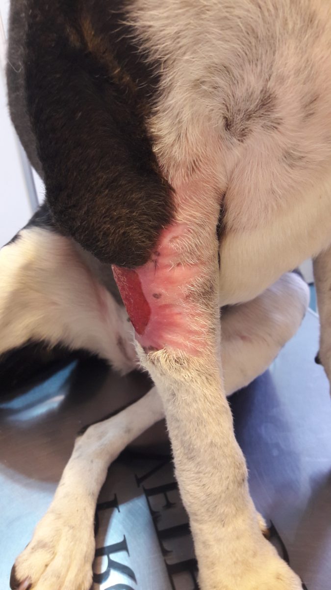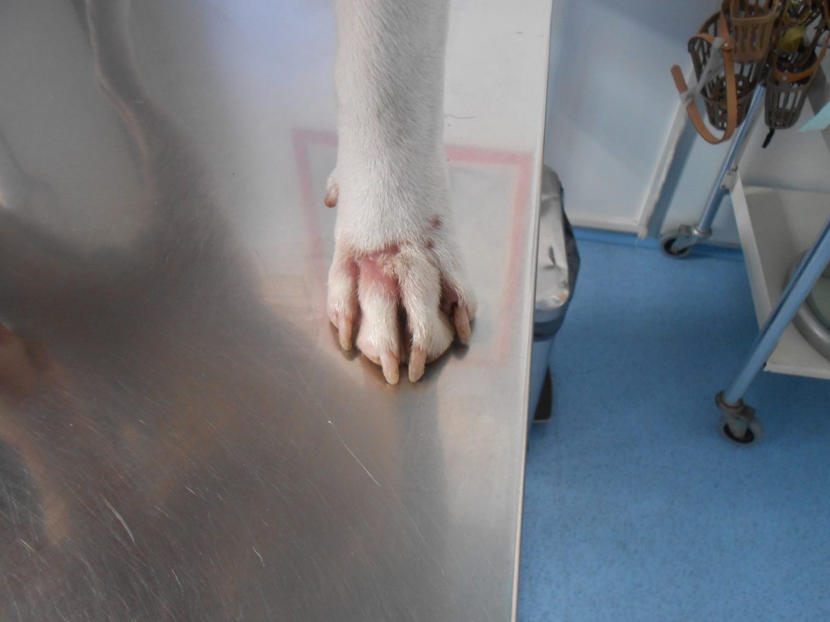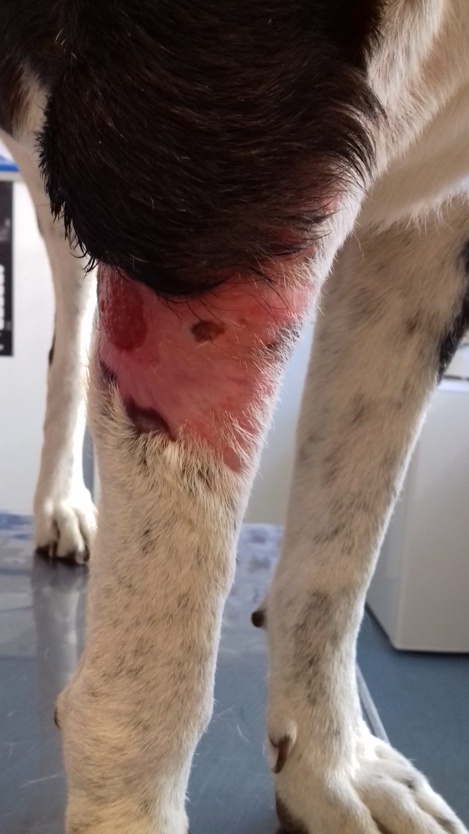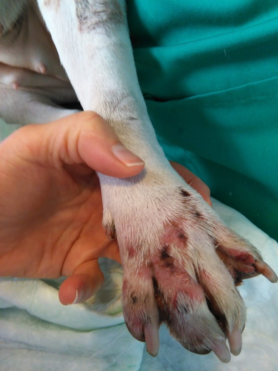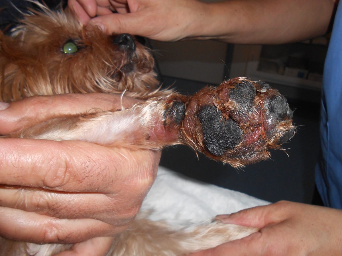 Perro atropellado con lesiones graves en mano con pérdida de tejidos. Tratamiento exclusivo con Ozono.